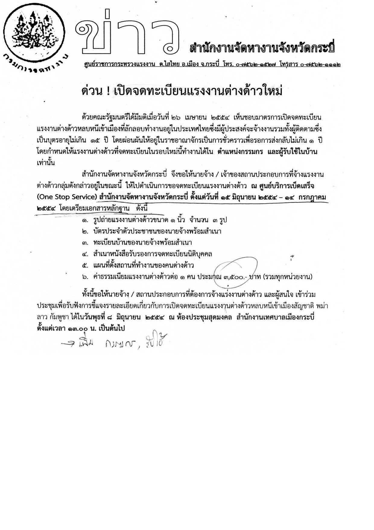 ประชาสัมพันธ์ข่าวจาก สำนักงานจัดหางานจังหวัดกระบี่ เรื่อง การเปิดจดทะเบียนแรงงานต่างด้าวใหม่ เนื่องด้วย ตามมติคณะรัฐมนตรี วันที่ 26 เม.ย.54 เห็นชอบมาตรการเปิดจดทะเบียนแรงงานต่างด้าวหลบหนีเข้าเมือง ที่ลักลอบทำงานในประเทศไทย ซึ่งมีผู้ประสงค์จะจ้างงานรวมทั้งผู้ติดตามซึ่งเป็นบุตรอายุไม่เกิน 15 ปี โดยผ่อนผันให้อยู่ในราชอาณาจักรเป็นการชั่วคราวเพื่อรอการส่งกลับไม่เกิน 1 ปี โดยกำหนดให้แรงงานต่างด้าวที่จดทะเบียนในรอบใหม่ ทำงานได้ในตำแหน่งดังนี้