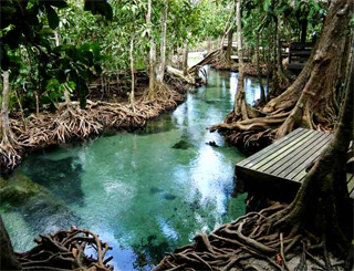 จุดเด่นอีก อย่างหนึ่ง คือสีสันของน้ำในคลองที่เปลี่ยนไปจากน้ำสีใสของน้ำจืดเป็นสีเขียวมรกตยามน้ำ เค็มเข้ามาผสมและเป็นสีฟ้าได้ในที่สุดซึ่งเป็นปรากฏการณ์น่าตื่นตาตื่นใจยาม เมื่อเวลาน้ำทะเลหนุนขึ้นมาถึงในคลองจนทำให้ที่นี่เป็นนิเวศสองน้ำแหล่ง เดียวในประเทศไทยบนสายธารหลากสี