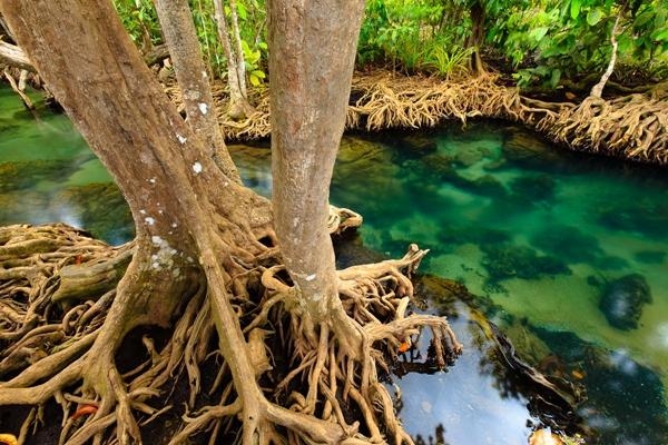 จุดเด่นอีก อย่างหนึ่ง คือสีสันของน้ำในคลองที่เปลี่ยนไปจากน้ำสีใสของน้ำจืดเป็นสีเขียวมรกตยามน้ำ เค็มเข้ามาผสมและเป็นสีฟ้าได้ในที่สุดซึ่งเป็นปรากฏการณ์น่าตื่นตาตื่นใจยาม เมื่อเวลาน้ำทะเลหนุนขึ้นมาถึงในคลองจนทำให้ที่นี่เป็นนิเวศสองน้ำแหล่ง เดียวในประเทศไทยบนสายธารหลากสี