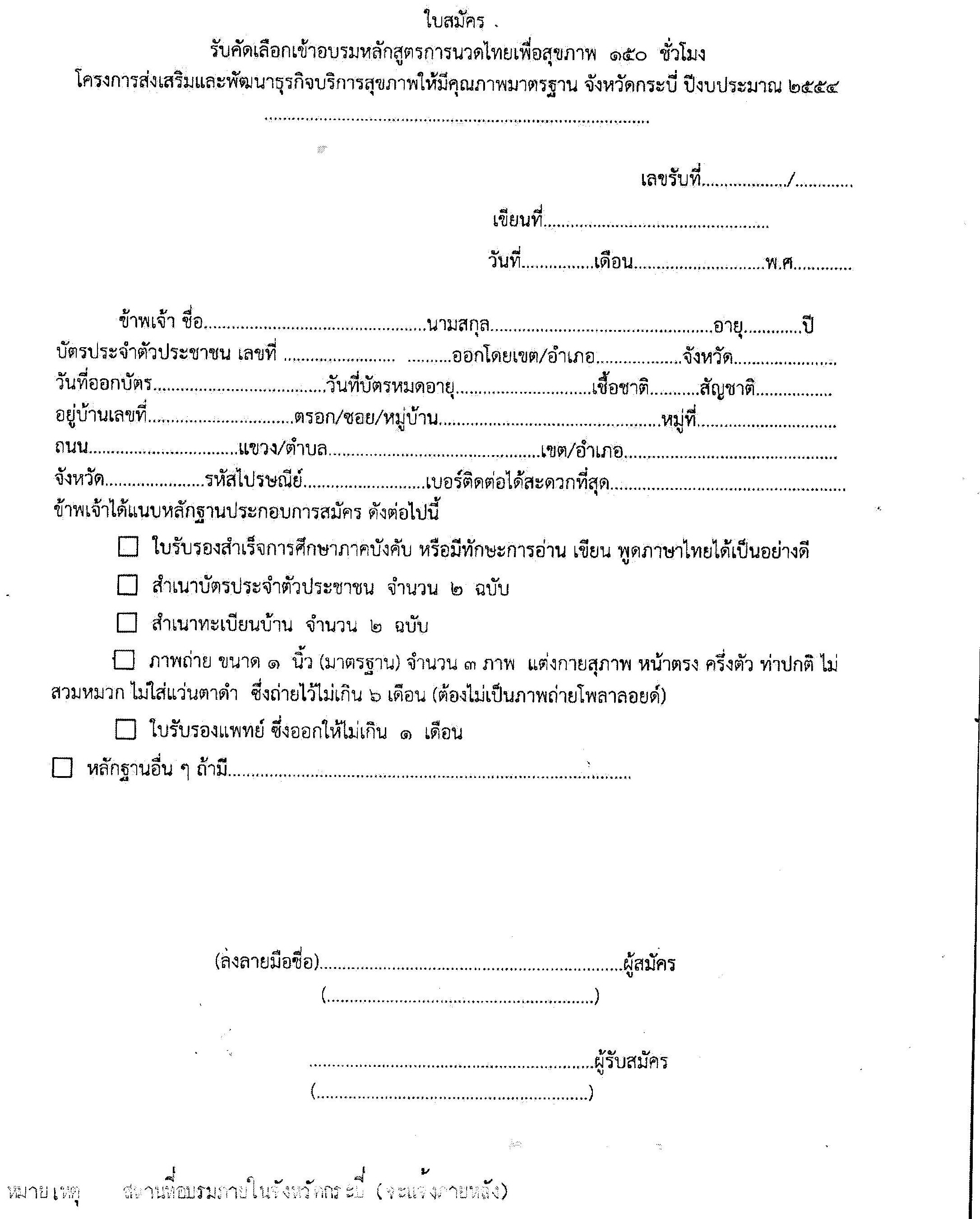 สำนักงานสาธารณสุขจังหวัดกระบี่ จะดำเนินการรับสมัครคัดเลือกประชาชนและผู้สนใจทั่วไป เข้าร่วมอบรมหลักสูตรการนวดไทยเพื่อสุขภาพ ๑๕๐ ชม. จำนวน ๓๐ คน ตามโครงการ “ส่งเสริมและพัฒนาธุรกิจการบริการสุขภาพให้มีคุณภาพมาตรฐาน จังหวัดกระบี่ ปีงบประมาณ ๒๕๕๔” โดยผู้สนใจสามารถยื่นใบสมัครได้ตั้งแต่วันนี้ถึงวันที่ ๒๐ มิถุนายน ๒๕๕๔ ณ กลุ่มงานคุ้มครองผู้บริโภค สำนักงานสาธารณสุขจังหวัดกระบี่ (รายละเอียดตามเอกสารแนบท้าย)