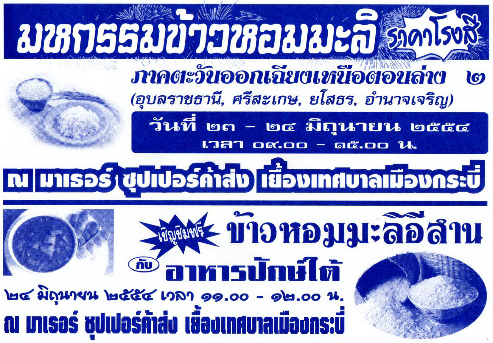 สำนักงานพาณิชย์จังหวัดกระบี่ ร่วมกับกลุ่มจังหวัดภาคภาคตะวันออกเฉียงเหนือตอนล่าง ประกอบด้วย จังหวัดอุบลราชธานี ศรีสะเกษ อำนาจเจริญ และยโสธร ได้กำหนดจัดกิจกรรม เจรจาธุรกิจ / ซื้อขายข้าวหอมมะลิ ราคาโรงสี (ทั้งปลีกและส่ง) ผู้ที่สนใจสามารถเชิญร่วมงานได้ ในวันที่ 23-24 มิถุนายน 2554 ณ ห้างสรรพสินค้าซุปเปอร์มาเธอร์ สาขา2 เยื้องเทศบาลเมืองกระบี่ ถ.มหาราช เปิดจำหน่ายตั้งแต่เวลา 09.00-15.00 น.