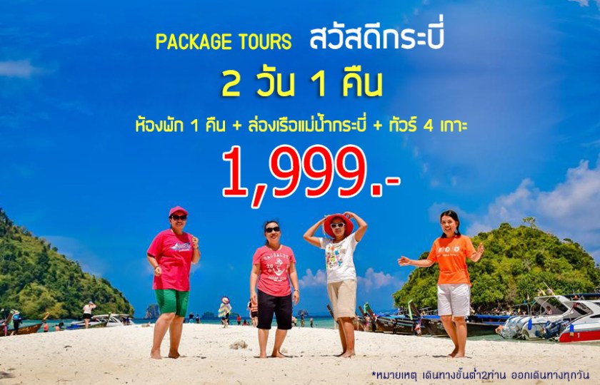 แพ็คเกจทัวร์ “สวัสดี กระบี่”1ประทับใจกับ 2 วัน 1 คืน พักผ่อนสบายๆ ดื่มด่ำกับธรรมชาติกระบี่ ด้วยกิจกรรมหลากหลาย เช่นเที่ยวหมู่เกาะ, ดำน้ำชมปะการังรวมทั้งโปรแกรมกับสถานที่ท่องเที่ยวที่สำคัญ เช่น ทะเลแหวก อ่าวไร่เล เกาะปอดะ และ เกาะพีพี